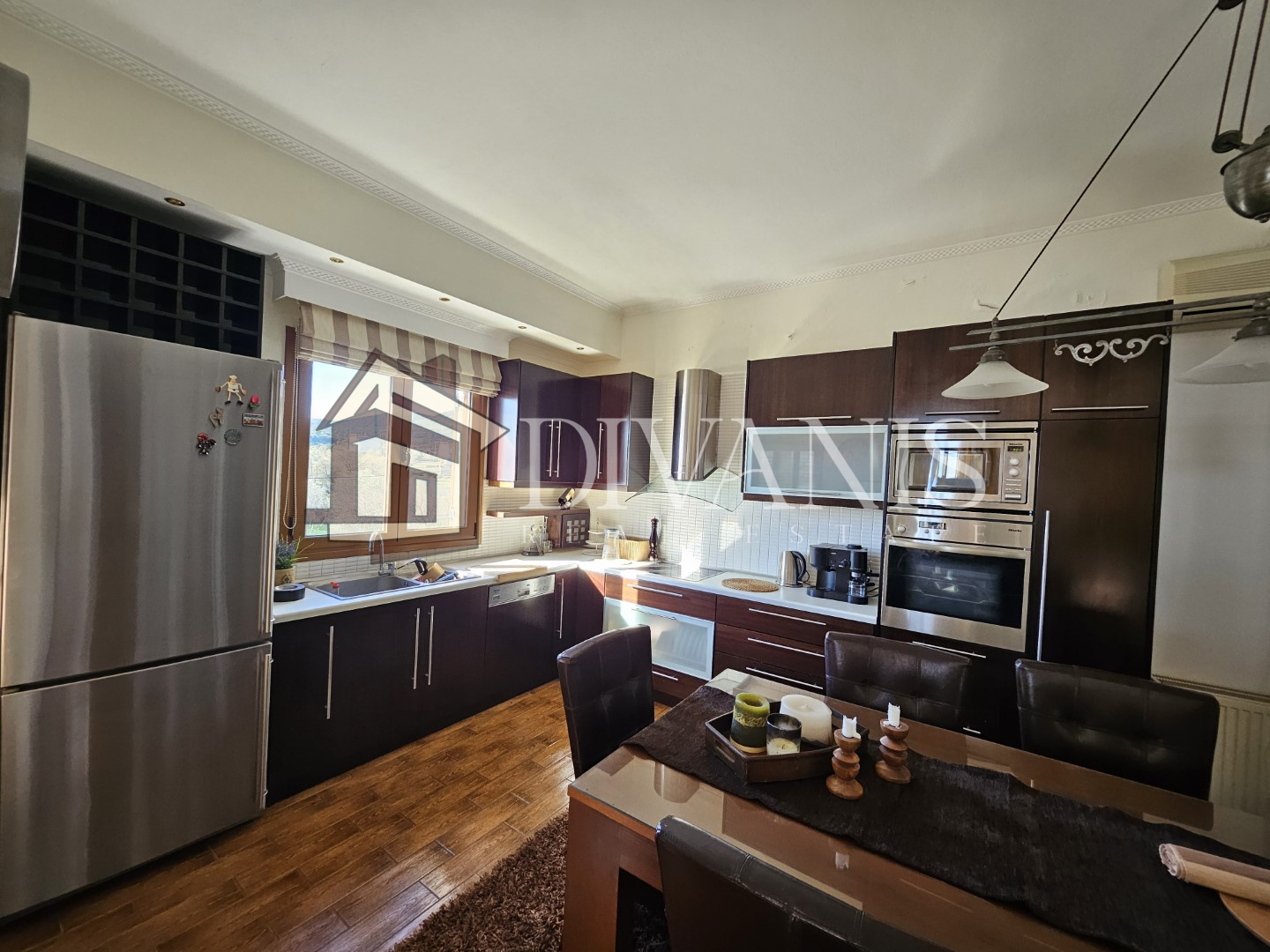 Όλες οι συσκευές κουζίνας: απορροφητήρας, εστίες, φούρνος, πλυντήριο πιάτων, φούρνος μικροκυμάτων είναι λειτουργικές, Inox, Miele.